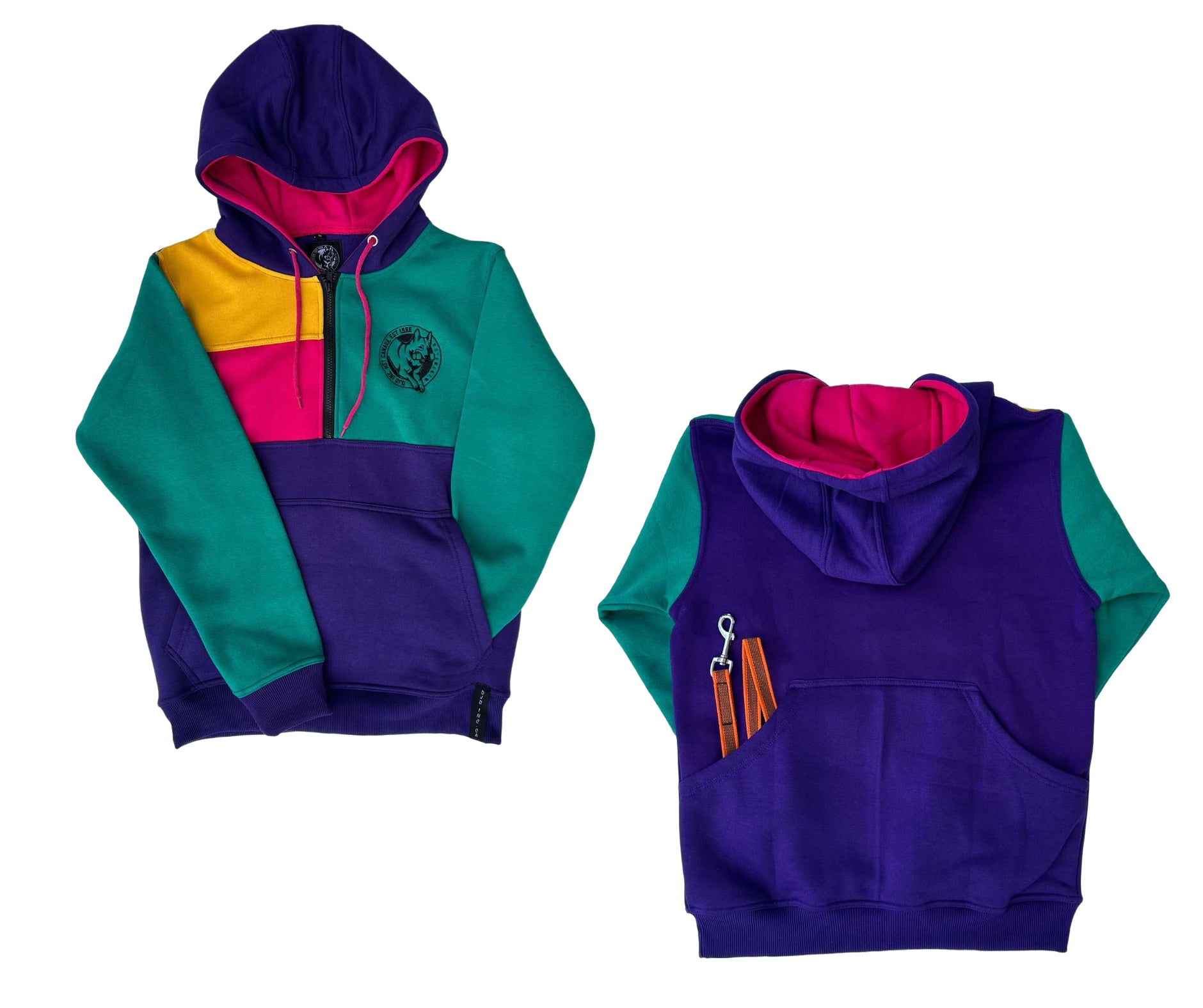 Heading out for some downtown socialization? A visit to a doggy cafe? Maybe a training client's home where you want to look a little more chic while still having room for rewards? Our fun half zip hoodie is for those looking to add a little chic to their canine trainer wardrobe in the popular 90s colour block mode!