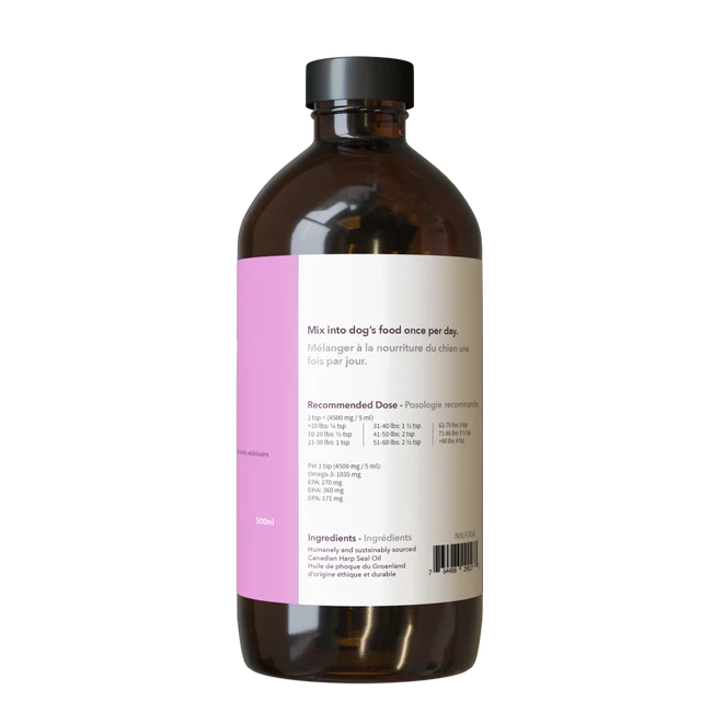 Favorisez le bien-être de votre chien grâce à une source exceptionnelle d'oméga-3 provenant des eaux pures et froides de l'Atlantique Nord canadien. L'huile de phoque, issue d'une pêche durable, offre un mélange naturellement équilibré d'EPA, de DHA et de DPA, un oméga-3 généralement absent des huiles de poisson.